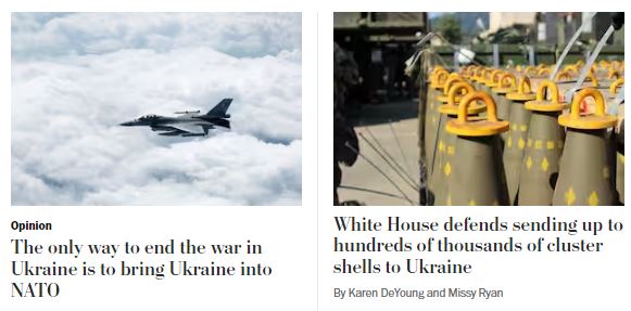 An editorial in the July 8 Washington Post suggests a way to end the war: get Ukraine to join NATO. They would probably do it if they NATO would let them. Biden might let them, too, if the much-vaunted Ukrainian counterattack is failing, and I suspect it is although no one can tell because the state department hasn’t told the American “newspersons” to say anything about that.