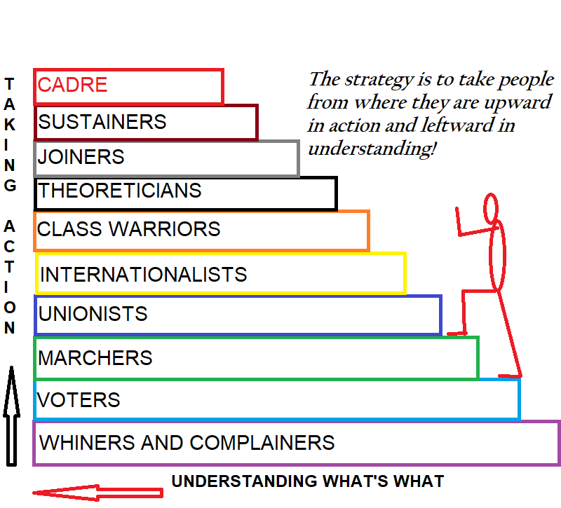 The sixth step is “class warriors.” At this stage of understanding and activity, people support working families as the only category of people capable of standing up to the bosses. They recognize the reactionary nature of the bosses and their system, and they know that our profit-based employer dominating system needs to be changed. They may have, and probably did, start on this staircase with something else in mind.